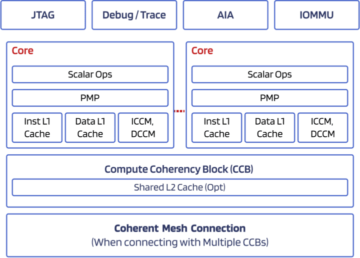 La société a également introduit des « blocs IP de système de processeur » nécessaires à la conception de SoC, notamment un cache de cluster cohérent, une MMU d’E/S et des IP de contrôleur d’interruption. Akeana fournit également des IP Scalable Mesh et Coherence Hub (compatibles avec AMBA CHI) pour créer de grands sous-systèmes de calcul cohérents pour les centres de données et d’autres cas d’utilisation. Enfin, un moteur de calcul AI Matrix conçu pour décharger les opérations de multiplication de matrice pour l’accélération de l’IA est également disponible.