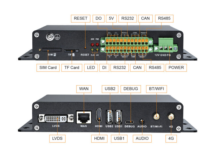 La passerelle de qualité industrielle sans fan propose RS232, RS485, BUS, DO, DO et DI via des terminaux, Fast Ethernet, WiFi, Bluetooth et 4 Go de connectivité LTE, HDMI et LVDS affichent des interfaces, quelques ports USB, et plus encore.