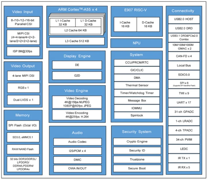 Allwinner T536 SOC propose quatre cœurs Cortex-A55, un noyau RISC-V à 600 MHz et un RISC-V à faible puissance pour la gestion de l’alimentation, ainsi que la prise en charge de la mémoire ECC et une NPU en option avec jusqu’à 3 sommets de performances d’IA.