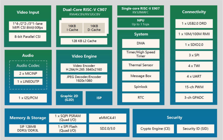 Selon cnx-software, l’Allwinner V861 est un nouveau système intégré (SiP) basé sur l’architecture RISC-V, offrant un processeur double cœur C907 et une capacité de traitement AI de 1 TOPS. Conçu pour les applications de caméras 4K, ce SoC comprend également 128 Mo de mémoire DDR3L sur puce, soulignant son potentiel dans le domaine de l’intelligence artificielle.