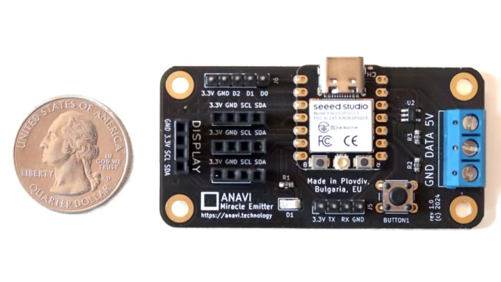 Anavi Miracle Emitte est un manuel open source ESP32-C3 et un contrôleur BLE BLE conçu pour contrôler les bandes LED RVB adressables 5V, qui fonctionne avec l’assistant à domicile sur MQTT et prend également en charge le firmware WLED populaire pour contrôler facilement la bande LED via une interface Web.