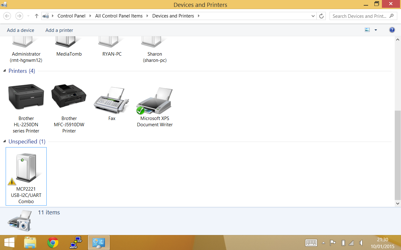 Recherchez ensuite les périphériques et imprimantes à l’aide de la fonction de recherche, puis faites défiler vers le bas de la page. Vous devriez voir un nouvel appareil appelé « MCP2221 Combo USB-I2C / UART » en bas.