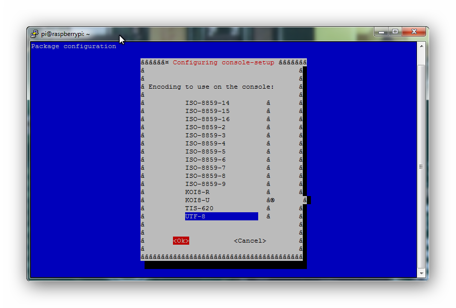 À l’aide des touches fléchées haut/bas, sélectionnez « UTF-8 ». À l’aide de la touche fléchée droite, sélectionnez « OK » et appuyez sur ENTER.