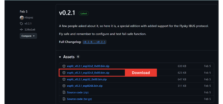 Une fois la page du référentiel ouverte, accédez au Sorties section. La page des versions contient des binaires de micrologiciels précompilés pour différents contrôleurs de vol basés sur ESP. À partir de là, téléchargez le fichier .zip du firmware spécialement conçu pour le microcontrôleur ESP32-S3 puisque LiteWing est basé sur la plate-forme ESP32-S3.