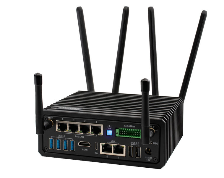 Les sockets d’extension incluent un emplacement M.2 E-Key 2230 pour modules WiFi/Bluetooth et un socket B-Key 3042/3052 avec slot SIM intégré pour la connectivité 4G LTE/5G. Six emplacements d’antennes permettent de gérer simultanément WiFi, cellulaire et communications OOB (Out-of-Band).