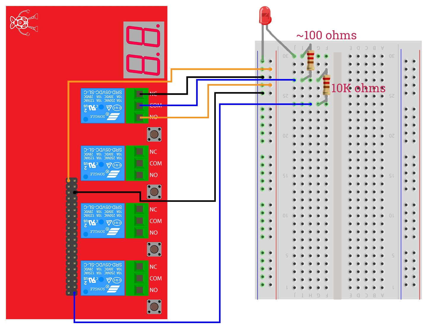Pour ce faire, connectez simplement l’un des relais comme indiqué dans le schéma ci-dessous. Nous avons également inclus une LED dans le circuit pour une confirmation visuelle également!