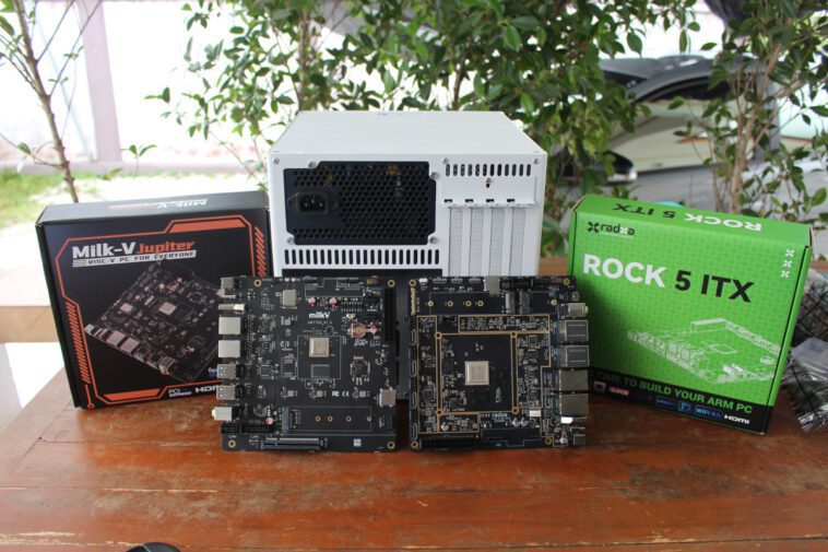 La Radxa ROCK 5 ITX est une carte mère mini-ITX alimentée par un processeur octa-core Rockchip RK3588 Cortex-A76/A55, et la Shenzhen Milk-V Jupiter est une autre carte mère mini-ITX, mais basée sur le processeur octa-core 64 bits RISC-V SpacemIT K1.