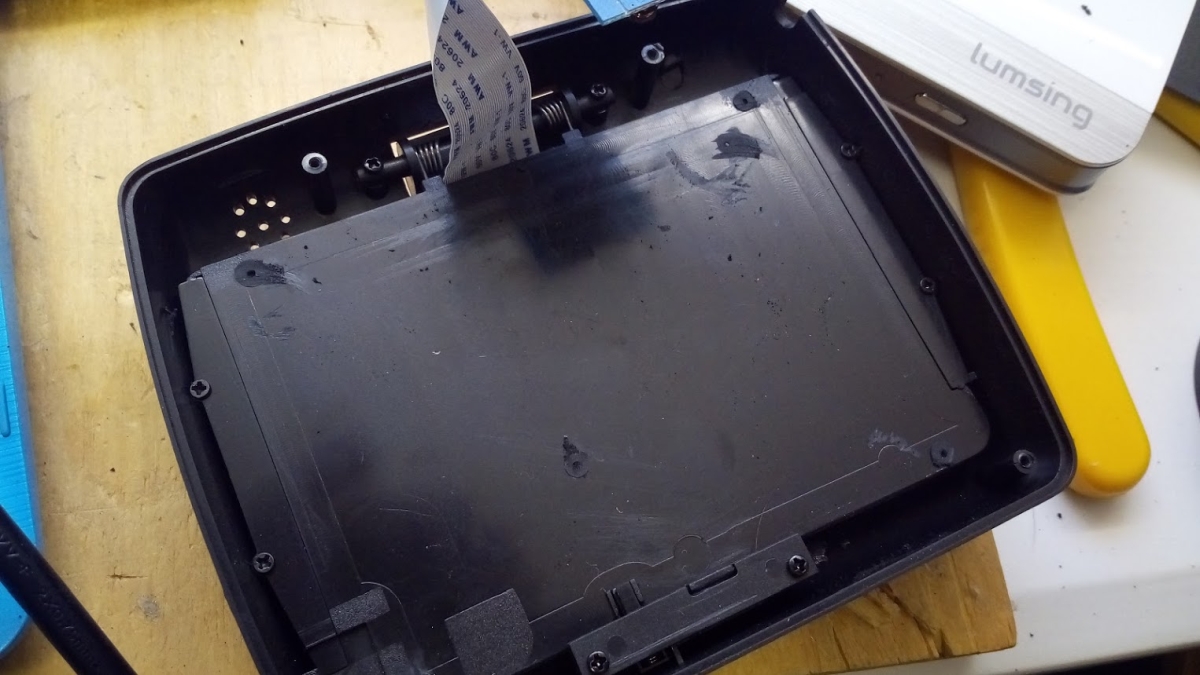 Je l’ai enlevé et j’ai jeté un coup d’œil pour voir quelles étaient les possibilités. À ma grande surprise, la carte du pilote d’écran était minuscule (plus à ce sujet plus tard) et il y avait beaucoup de place. Pas pour un Pi 3 complet, peut-être, avec son en-tête à 40 broches pré-soudé, mais un Zero W s’intégrerait très confortablement. J’ai pris un outil rotatif sur certains des supports de la plaque de base (mais pas les «tubes» de vis):