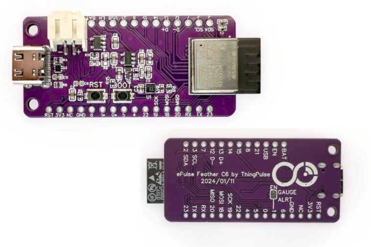 ThingPulse ePulse Feather C6 est une nouvelle carte de développement ESP32-C6 avec connectivité WiFi 6, BLE5, Zigbee, Thread et Matter qui suit le facteur de forme Adafruit Feather et prend en charge le chargement de la batterie LiPo via un circuit intégré de chargeur et une jauge de carburant.