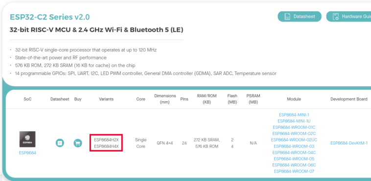L’ESP32-C2 a été dévoilé pour la première fois en avril 2024 avec des détails limités, et lancé en octobre de la même année que le SIP ESP8684 combinant ESP32-C2 avec un flash de 4 Mo, ainsi que quelques modules ESP8684 et le Board de développement ESP8684-Devkitm-1. L’ESP32-C2 est censé être une version coûteuse de l’ESP32-C3 avec moins de RAM et de périphériques, et le ESP32-C2 V2.0 légèrement amélioré sur celui avec des pièces ajoutant X au nom: ESP8684H2X (Flash 2MB) et ESP8684H4X (4MB Flash). Les modules et les noms Devkit sont également touchés, bien que non encore représentés dans la capture d’écran ci-dessous.