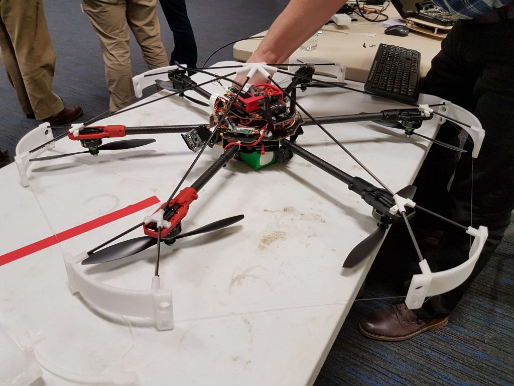 Deux des participants utilisaient des drones alimentés par Raspberry Pi. L’un était un hélicoptère hexagonal (voir 0:57 dans la vidéo ci-dessous) créé par Mike Isted et a un Pi 3 monté sur le dessus dans un boîtier rouge.
