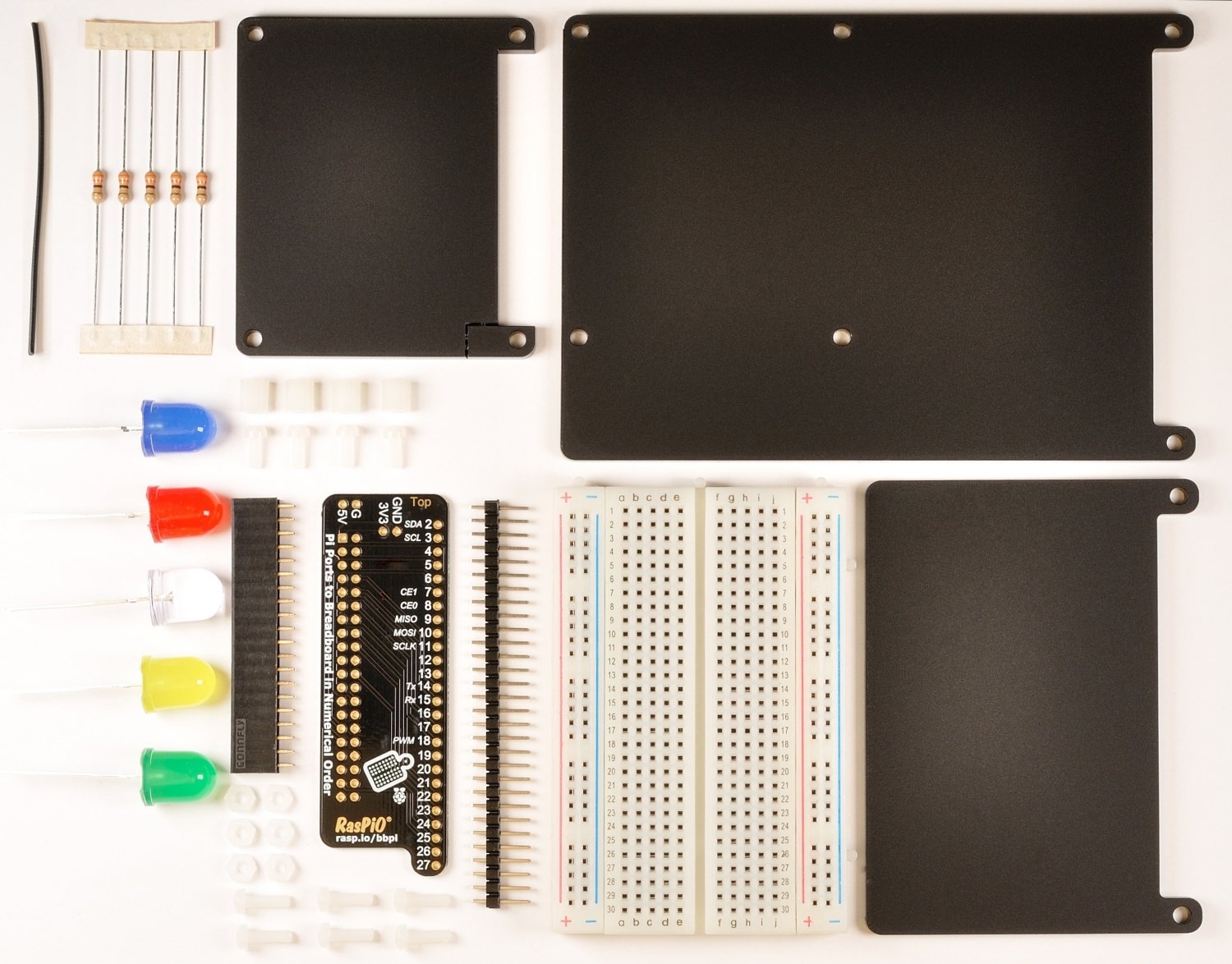 Le pont se trouve au-dessus des broches GPIO de votre Pi, puis casse les broches (vers l’arrière), puis se branche sur la platine d’essai fournie. Les broches sont, dans le «style Alex» typique, en ordre numérique Broadcom. En termes simples, cela signifie que des choses comme GPIO Zero «fonctionneront tout simplement» lorsqu’elles utiliseront le système de numérotation Broadcom. Alors, plus besoin de chercher la bonne épingle. Le kit (qui doit être soudé) est livré avec des plaques en plexiglas pour le fond et pour couvrir le Pi (si vous le souhaitez) et toutes les fixations dont vous avez besoin. Il est également livré avec une sélection de LED et de résistances, et un fil supplémentaire si vous souhaitez connecter l ‘«autre» rail de mise à la terre sur la planche à pain. En fait, il est livré avec tout ce que vous voyez dans l’image ci-dessous. La seule chose qui ne vient pas est le Pi lui-même, mais je suis sûr que vous savez où aller pour l’un d’eux maintenant!