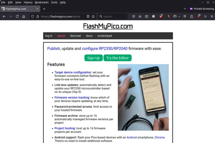 Je lui ai donné un rapide avec une planche Raspberry Pi Pico 2. La première étape consiste à vous diriger vers Flashmypico.com depuis votre ordinateur ou même sur un smartphone Android. Vous aurez besoin d’un navigateur Web qui prend en charge WebSerial / WebUSB, donc par exemple, Firefox n’est pas une option, et j’ai finalement dû utiliser Google Chrome à la place.
