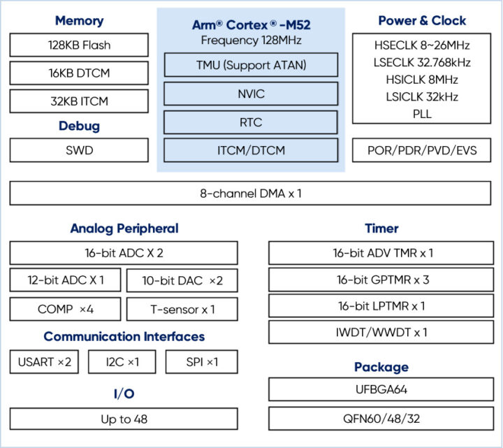 Ce MCU est équipé de 48 Ko de SRAM, repartis entre 16 Ko de DTCM et 32 Ko d’ITCM, en plus d’un espace système de 8 Ko pour le chargeur de démarrage. Le G32R430 intègre également une unité mathématique trigonométrique (TMU) spécialisée pour les opérations d’arctangente, ce qui permet d’alléger significativement les calculs d’angle du logiciel. Grâce à cette structure, le MCU peut atteindre une sortie d’angle électrique avec une latence inférieure à 1 µs et une précision de 0,0001°.