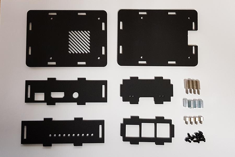 Soulevez délicatement le Pi et les plaques latérales et placez-les sur la plaque inférieure. Assurez-vous que la fente pour carte SD sur le Pi est alignée avec la découpe sur la plaque. Fixez avec 4 vis noires.