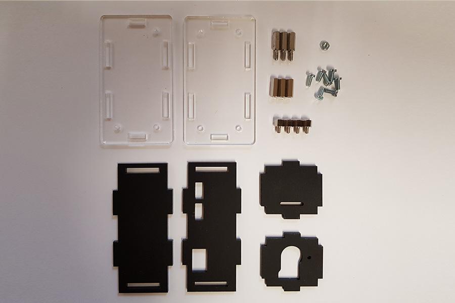 Suivez ces images en vérifiant les pièces et l’orientation des pièces en acrylique. Vous verrez une image avant et après pour chaque étape. Assurez-vous que toutes les pièces sont prêtes, comme illustré dans l’image précédente.