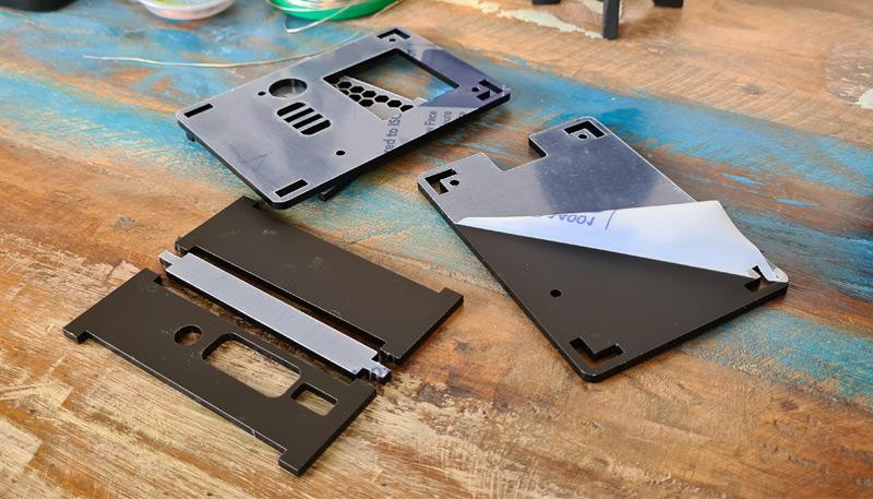 1. Les parties découpées au laser de l’étui sont protégées par un film adhésif qu’il faut retirer avant l’assemblage (c’est *très* thérapeutique), il suffit de le décoller :