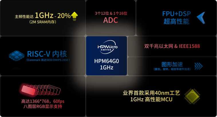 Mais finalement, j’ai trouvé un article en chinois sur EETrend où l’on peut en savoir plus sur le HPM64G0 qui se trouve être un microcontrôleur 1 GHz basé sur l’architecture RISC-V. Nous en avions déjà un pour Arm avec le NXP i.MX RT1170, mais je n’avais pas encore vu de microcontrôleurs RISC-V cadencés à une fréquence aussi élevée.