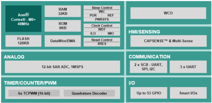 - Blocs de communication série 2x (SCBS) Soutenant I2C, SPI, UART (Runtime reconfigurable); Un SCB peut fonctionner dans n’importe quel mode; L’autre est un bloc maître / esclave I2C