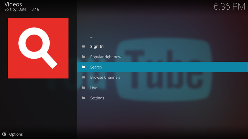 Le module complémentaire YouTube est maintenant installé et prêt à être utilisé. Le menu propose des options pour rechercher, parcourir et afficher ce qui est populaire :