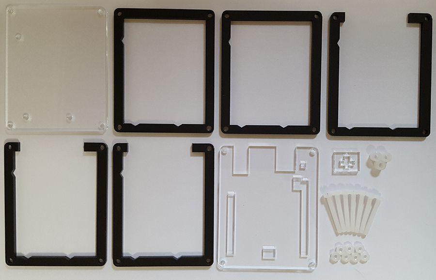 Suivez ces images en vérifiant les pièces et l’orientation des pièces en acrylique. Vous verrez une image avant et après pour chaque étape. Assurez-vous que toutes les pièces sont prêtes, comme illustré dans l’image précédente.