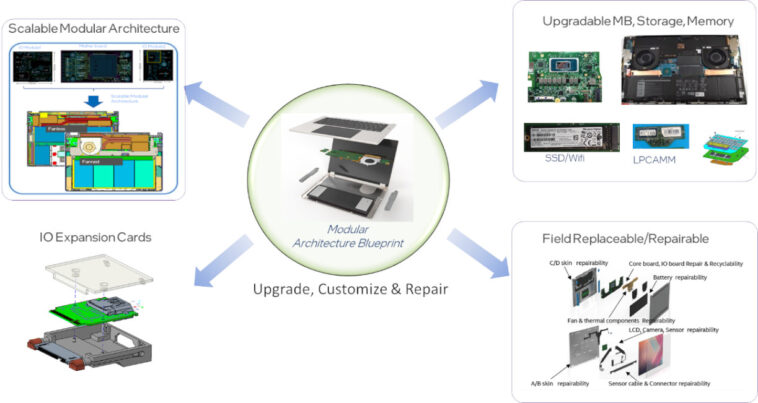 Intel a publié un article proposant une conception de PC modulaire qui améliorerait la réparabilité/le droit à la réparation des ordinateurs portables et des mini PC et réduirait les déchets électroniques grâce au remplacement de la carte mère, de l’écran et des modules complémentaires M.2 ou FPC pour les ports orientés utilisateur.