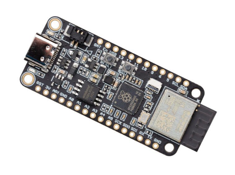 La carte suit le format Feather d’Adafruit avec des trous traversants à 28 broches pour les E/S, ce qui la rend compatible avec les cartes complémentaires FeatherWings. Elle est livrée avec un port USB-C pour l’alimentation et la programmation, ainsi qu’un connecteur JST et un circuit de charge pour les personnes souhaitant connecter une batterie LiPo.