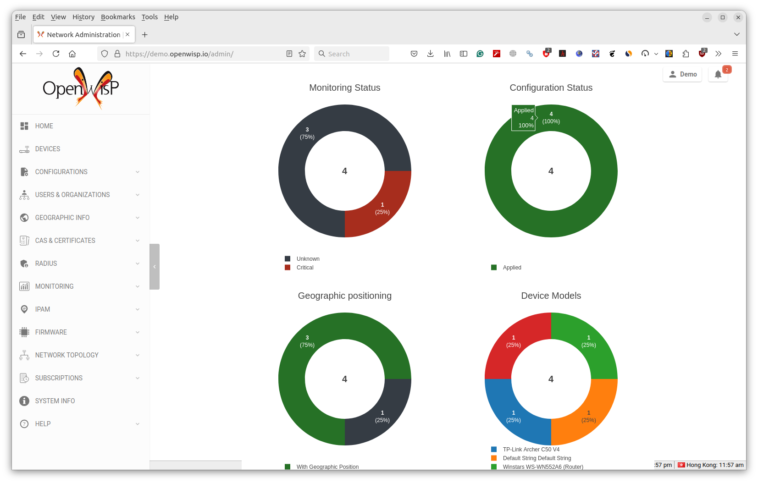 Mais pour avoir une idée rapide de l’interface, vous n’avez pas besoin de passer par le processus d’installation complet car il y a un site Web de démonstration. Lors de la connexion, nous accédons à un tableau de bord avec l’état de surveillance, l’état de configuration, le positionnement géographique (si disponible / ensemble), les modèles de périphériques, les statistiques de trafic et bien plus encore. C’est la première capture d’écran de ce post.