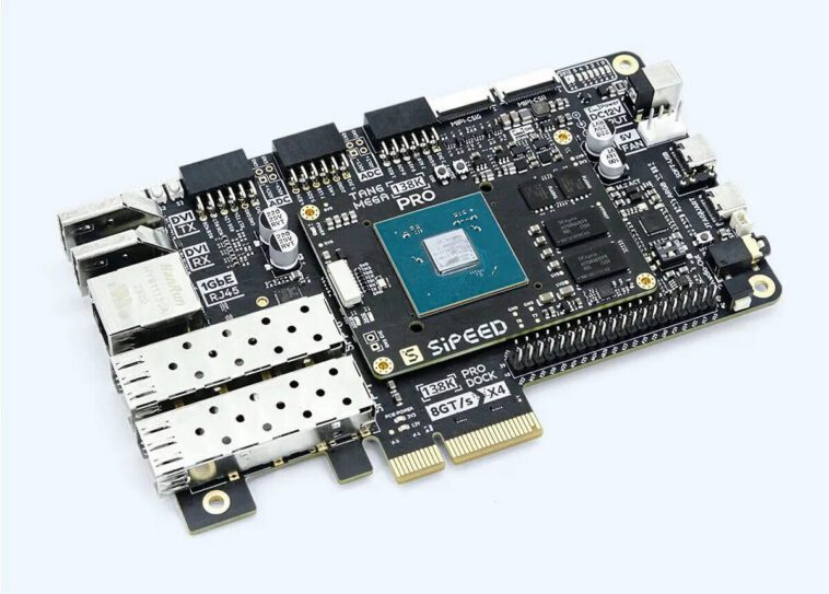 Sipeed a lancé une autre carte FPGA faisant partie de sa famille Tang avec le Tang Mega 138K Pro Dock alimenté par un SoC GOWIN GW5AST avec 138K éléments logiques ainsi qu’une unité hardcore AE350_SOC RISC-V de 800 MHz, et doté d’une interface PCIe 3.0 x4, DVI Rx et Tx, deux cages SFP+, un port Gigabit Ethernet RJ45, et bien plus encore.