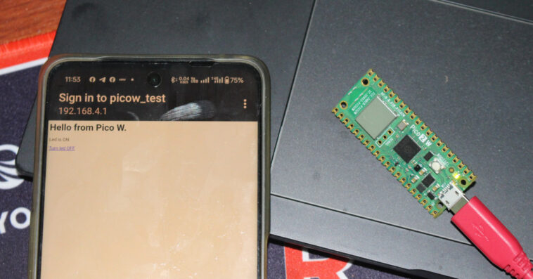 Il n’y avait toujours aucune sortie dans la console série, mais le point d’accès picow_test est apparu à la place. Après m’y être connecté en utilisant le mot de passe par défaut dans le code (« mot de passe »), j’ai été redirigé vers l’interface Web illustrée ci-dessus pour allumer ou éteindre la LED intégrée.