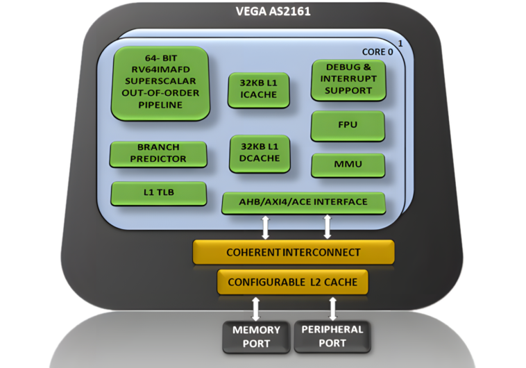 Les spécificités techniques du VEGA AS2161 (DHRUV64) comprennent plusieurs éléments clés. Tout d’abord, il repose sur l’architecture RISC-V avec un jeu d’instructions RISC-V 64G (RV64IMAFD). De plus, il intègre un pipeline de 13 à 16 étapes avec un prédicteur de branche avancé, et offre une architecture Harvard avec des mémoires d’instructions et de données séparées. Ce processeur comprend également différents niveaux de privilèges, notamment utilisateur, superviseur et mode machine.