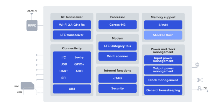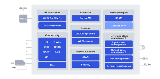 - SoC – Modem Qualcomm 216 LTE IoT avec Cortex-M3 double cœur à 204 MHz, modem cellulaire-RF
