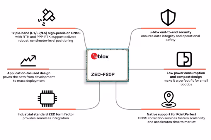 Conçu pour une faible consommation d’énergie et une convergence rapide, le ZED-F20P fonctionne à 25 Hz et intègre diverses fonctionnalités de sécurité, ce qui le rend adapté aux plates-formes légères et mobiles. Il est entièrement compatible avec l’empreinte du module ZED existant et le protocole UBX, permettant des chemins d’intégration et de mise à niveau faciles dans le portefeuille ZED. Le module fonctionne avec l’antenne ANN-MB2 All-Band et prend en charge les services PointPerfect Flex and Live de U-Blox, offrant une précision rapide et sans la station de base dans des environnements difficiles. Ces fonctionnalités rendent cela adapté à des applications telles que les tondeuses robotiques et les systèmes aériens autonomes.