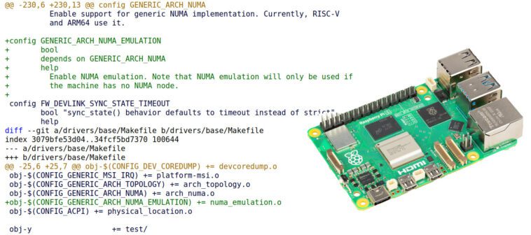 L’implémentation de l’émulation NUMA a été testée sur un SBC Raspberry Pi 5 et le score monocœur Geekbench 6 s’est amélioré de 6 %, tandis que le score multicœur a augmenté de 18 % après division en quatre nœuds NUMA émulés. En d’autres termes, cela équivaut à avoir un processeur Broadcom BCM2712 overclocké de 2,4 GHz à 2,83 GHz.