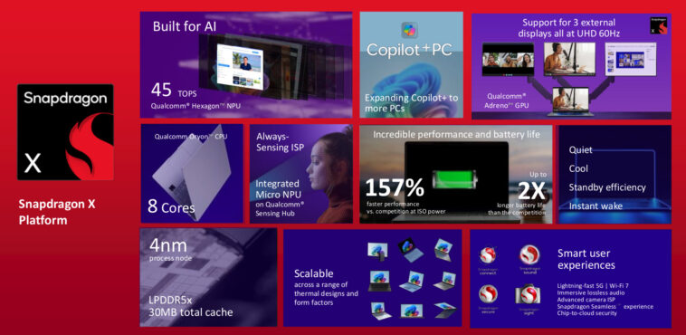 Le nouveau Snapdragon X est cadencé jusqu’à 3,0 GHz, dispose toujours d’un NPU Hexagon 45 TOPS, prend en charge le stockage NVMe, jusqu’à 64 Go LPDDR5, jusqu’à 2 560 x 1 440 écrans intégrés, jusqu’à trois écrans externes à 4Kp60 et un seul. caméra jusqu’à une résolution de 36MP. Les systèmes basés sur le nouveau processeur octa-core peuvent prendre en charge la connectivité WiFi 7, WiFi 6E et/ou 5G LTE.