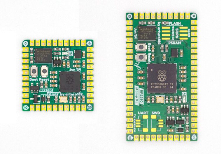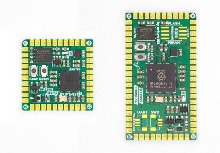Le RP2350 Stamp de Solder Party est une mise à jour du petit module RP2040 Stamp de la société basé sur un Raspberry Pi RP2350A, et ils ont également introduit le module RP2350 Stamp XL qui utilise les broches GPIO supplémentaires sur le RP2350B et une carte porteuse « RP2xxx Stamp Carrier XL » prenant l’un ou l’autre module.