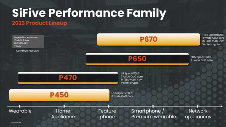 Le cœur SiFive Performance P670 est comparable au Arm Cortex-A78, peut atteindre une fréquence allant jusqu’à 3,4 GHz lorsqu’il est fabriqué avec un processus de 5 nm, offre une performance de plus de 12 SpecINT2k6/GHz, ainsi qu’une performance de thread unique plus élevée et deux fois la densité de calcul par rapport à la «solution héritée» (alias Cortex-A78), et intègre deux ALU Vector 128 bits conformes à la spécification RISC-V Vector v1.0 ratifiée. On le trouvera dans les appareils portables haut de gamme, les réseaux, la robotique et les SoC mobiles, et il s’agit d’une mise à niveau du SiFive Performance P650, qui ne dispose pas des extensions vectorielles.