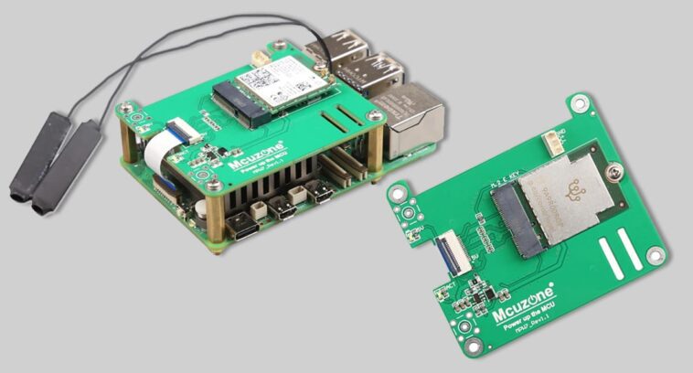 Le Mcuzone MPW7 HAT pour le Raspberry Pi 5 est conçu pour fonctionner avec 2230 modules Wi-Fi 7 M.2 E-Key comme les Intel BE200, AX210 et AX200, mais la prise M.2 peut également prendre en charge le Wi-Fi 6/ 6E ainsi que les Tensor Processing Units (TPU) de Google. Il intègre également le support Bluetooth via une interface USB 1,25 mm sur le HAT.