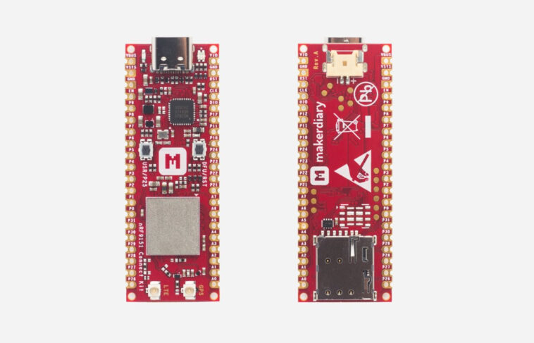 La carte dispose d’un port USB-C pour l’alimentation et la programmation, deux en-têtes à 20 broches pour l’expansion avec des trous à travers et des trous castels, une fente de carte Nano SIM et une empreinte pour un ESIM, des boutons d’utilisateur et de réinitialisation, et quelques LED utilisateur.