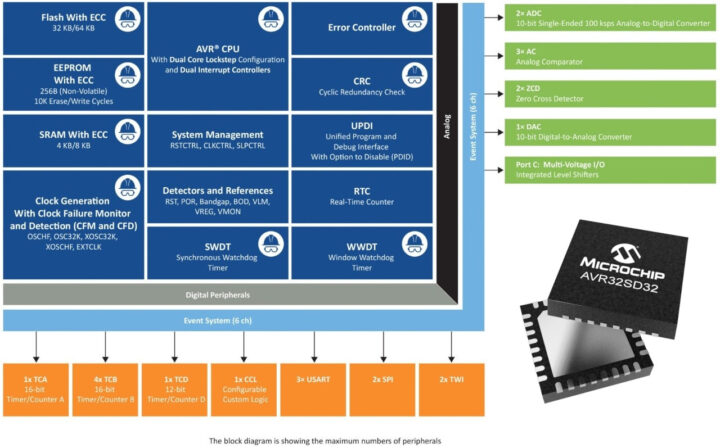 Les caractéristiques de sécurité matérielle incluent un CPU à double noyau, deux ADC pour la redondance, un code de correction d’erreur (ECC) sur toutes les souvenirs, un module de contrôleur d’erreur dédié, des mécanismes d’injection d’erreur et des moniteurs de tension et d’horloge. La société explique en outre que l’AVR SD MCU rencontre des objectifs d’intervalle de temps de détection de défauts (FDTI) aussi bas que 1 milliseconde, et son système de gestion de la sécurité fonctionnelle a été certifié par Tüv Rheinland.