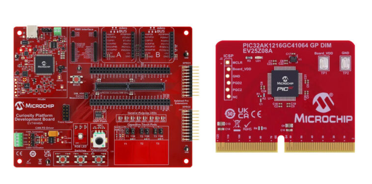 Microchip indique également que la carte de développement de la plate-forme de curiosité DSPIC33A (EV74H48A) peut être utilisée pour évaluer le PIC32A lorsqu’il est utilisé en combinaison avec le PIC32AK1216GC41064 à usage général DIM (EV25Z08A) qui se branche dans le socket dim pour la plate-forme de curiosité.