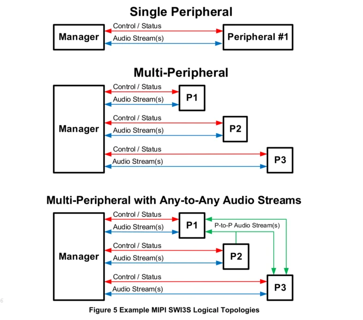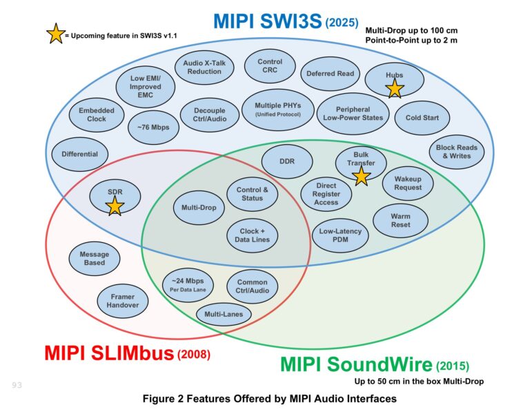La spécification MIPI SWI3S v1.0 atteint des débits de données pouvant aller jusqu’à 76 Mbps, alors que les anciennes interfaces telles que SLIMbus et SoundWire n’atteignaient que 24 Mbps. Ce nouvel standard améliore également l’immunité au bruit grâce à son fonctionnement via « horloge transmise » ou « signalisation différentielle basse tension ». En plus de cela, SWI3S introduit des fonctionnalités innovantes telles que des hubs dédiés, le support pour plusieurs PHY, et des méthodes avancées d’économie d’énergie.