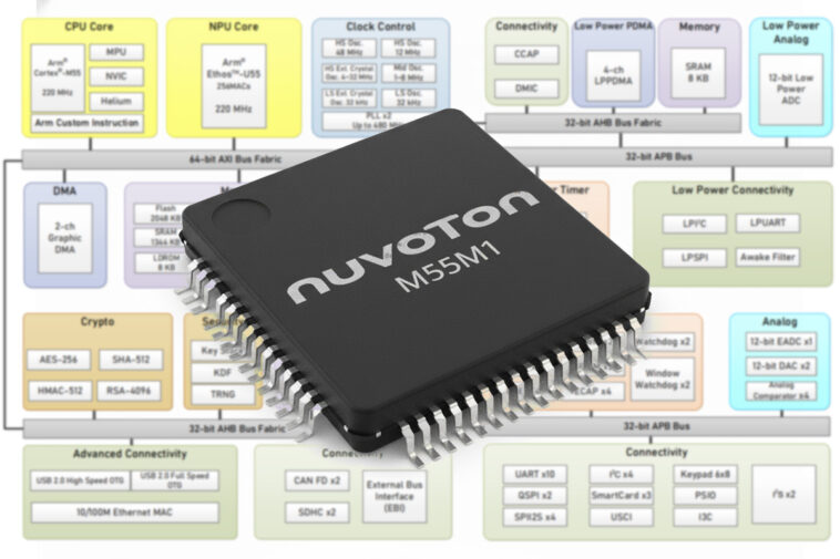 Selon cnx-software, le NuMicro M55M1 de Nuvoton se présente comme un microcontrôleur à faible consommation équipé d’un processeur Arm Cortex-M55 fonctionnant à 220 MHz, associé à un NPU Ethos-U55 capable d’atteindre jusqu’à 111 GOPS pour mener à bien des tâches d’intelligence artificielle directement sur l’appareil. Cette puce vise particulièrement les dispositifs IoT et embarqués nécessitant un traitement vocal, audio, ou d’images léger tout en conservant une faible consommation énergétique.