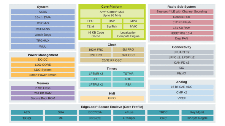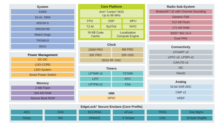 - Core de réseautage – Core Cortex-M33 ARM avec un flash dédié 512 Ko et un SRAM dédié à 171 Ko