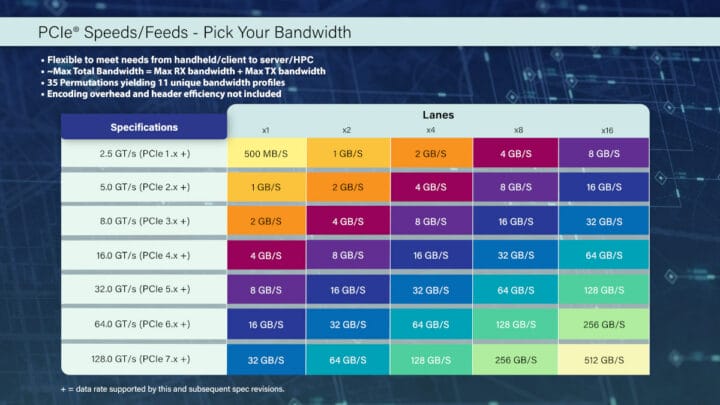 Le PCI-SIG a dévoilé pour la première fois la spécification PCIe Express (PCIe) 7.0 lors de l’US DevCon en juin 2022, avec des revendications de débits de données bidirectionnels allant jusqu’à 512 Go/s en configuration x16, et la norme se rapproche désormais de la version complète en 2025 avec la sortie de la spécification version 0.5.