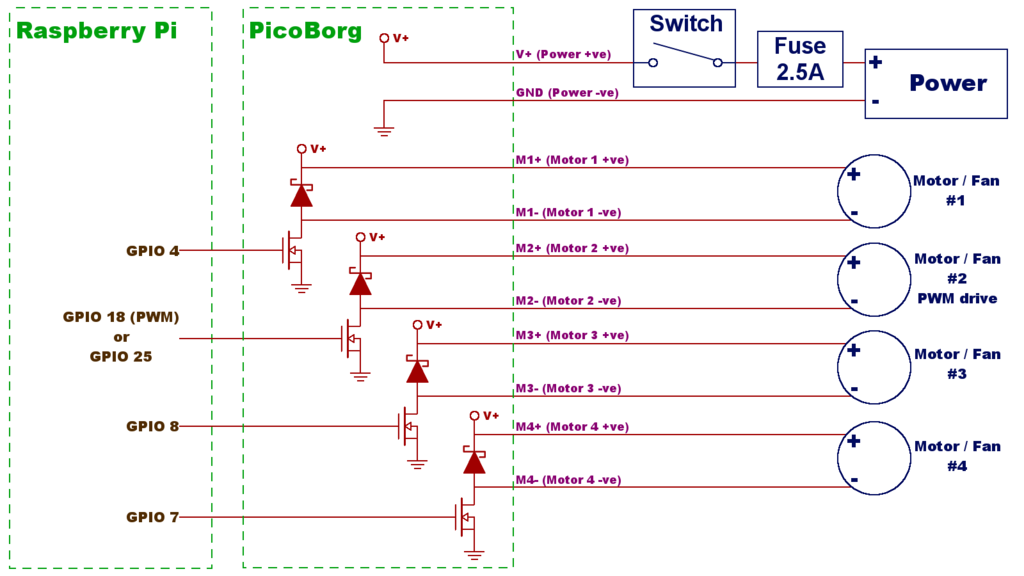 - Moteur. Le PicoBorg peut piloter des moteurs jusqu’à 20V (12V recommandé) ou 2,5A