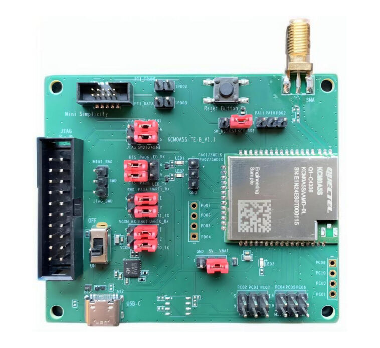 Le kit EVB QUectel KCM0A5S TE-B peut être utilisé pour évaluer le module KCM0A5S en connectant la carte via USB à un hôte exécutant un utilitaire QCOM. La carte dispose également d’un bouton de réinitialisation, de quelques cavaliers pour la configuration et de la mini-simplicité et des connecteurs JTAG pour le débogage et le clignotement du micrologiciel. La documentation pour contrôler la carte et flasher le firmware n’est pas publique, et vous devrez contacter l’entreprise pour obtenir des fichiers QUCTEL_QCOM_USER_GUIDE et QUCTEL_KCM0A5S_TEST_GUIDE.