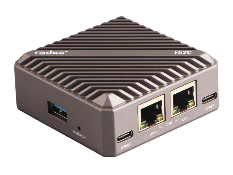 Radxa E52C est un routeur compact basé sur le SoC hexa-core Cortex-A76/A55 Rockchip RK3582 et doté de deux ports 2,5GbE, d’un port USB 3.0 et d’un port USB-C pour l’accès à la console série qui fera le bonheur de certains lecteurs…