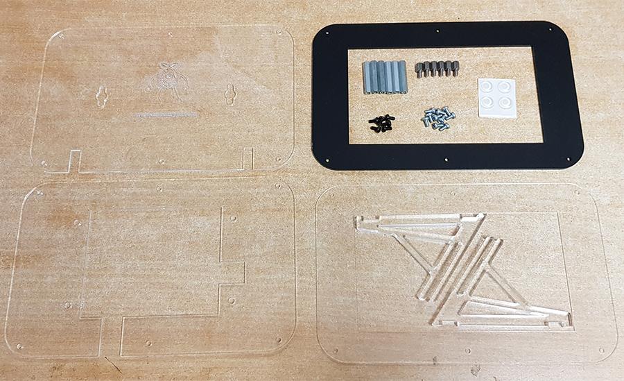 Suivez ces images en vérifiant les pièces et l’orientation des pièces en acrylique. Vous verrez une image avant et après pour chaque étape. Assurez-vous que toutes les pièces sont prêtes, comme illustré dans l’image précédente.