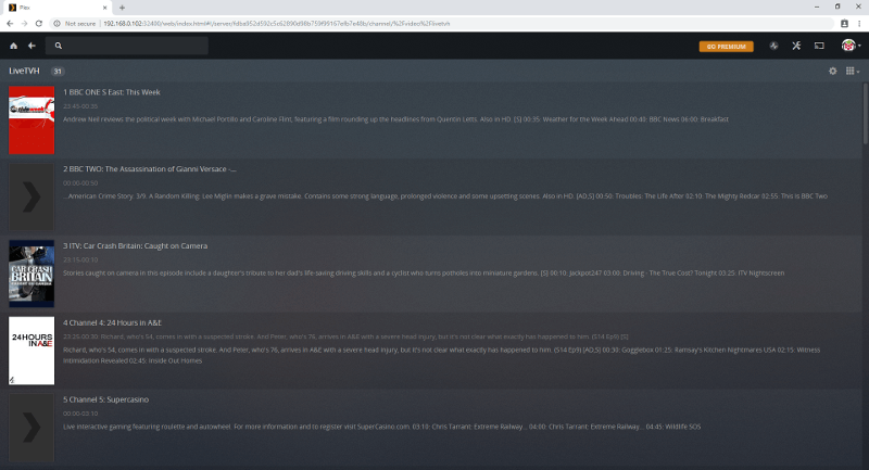 Accédez à la section des plugins Plex et cliquez sur l’icône LiveTVH. Vous devriez voir une liste des chaînes et le programme en cours de lecture: